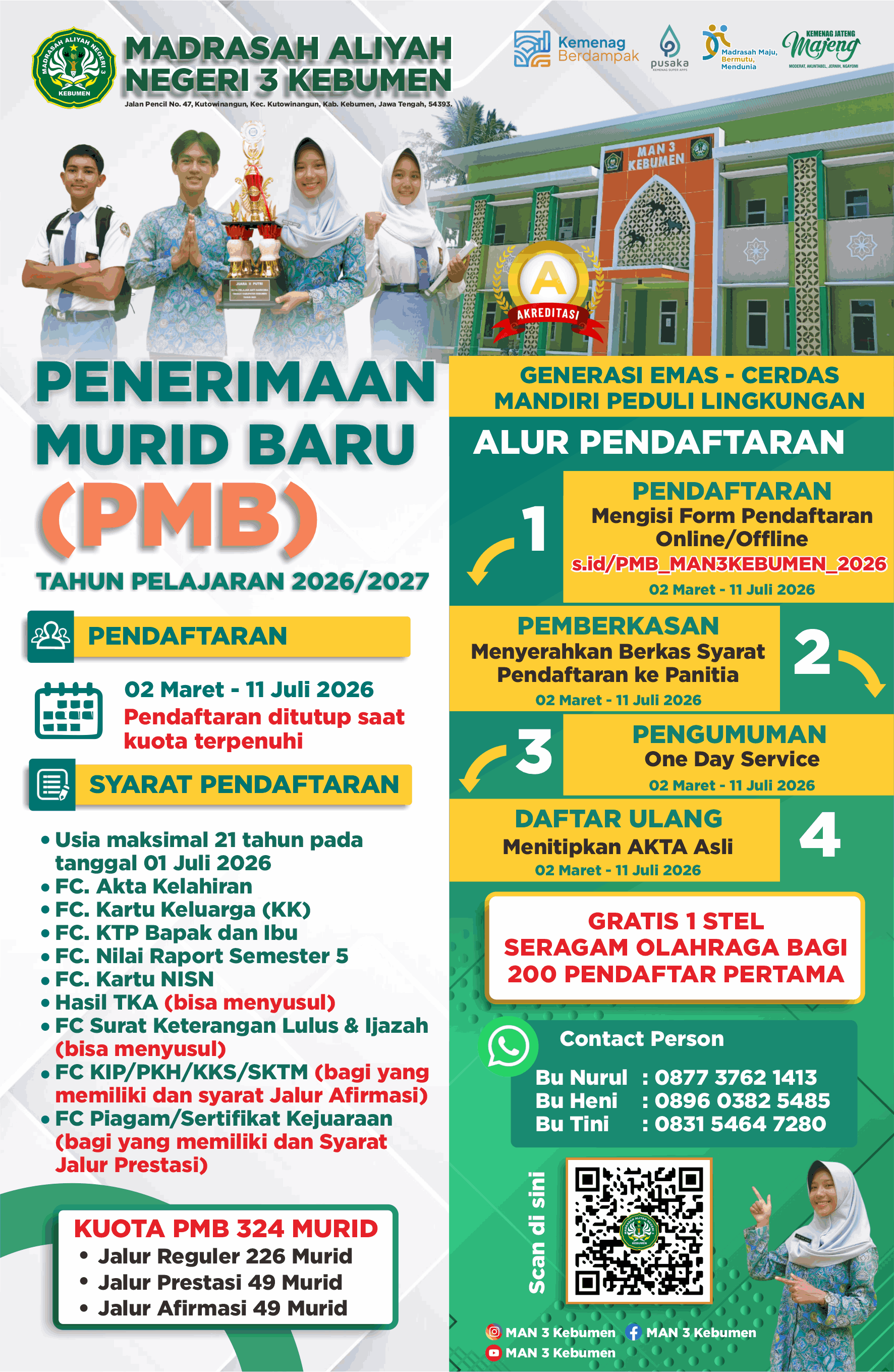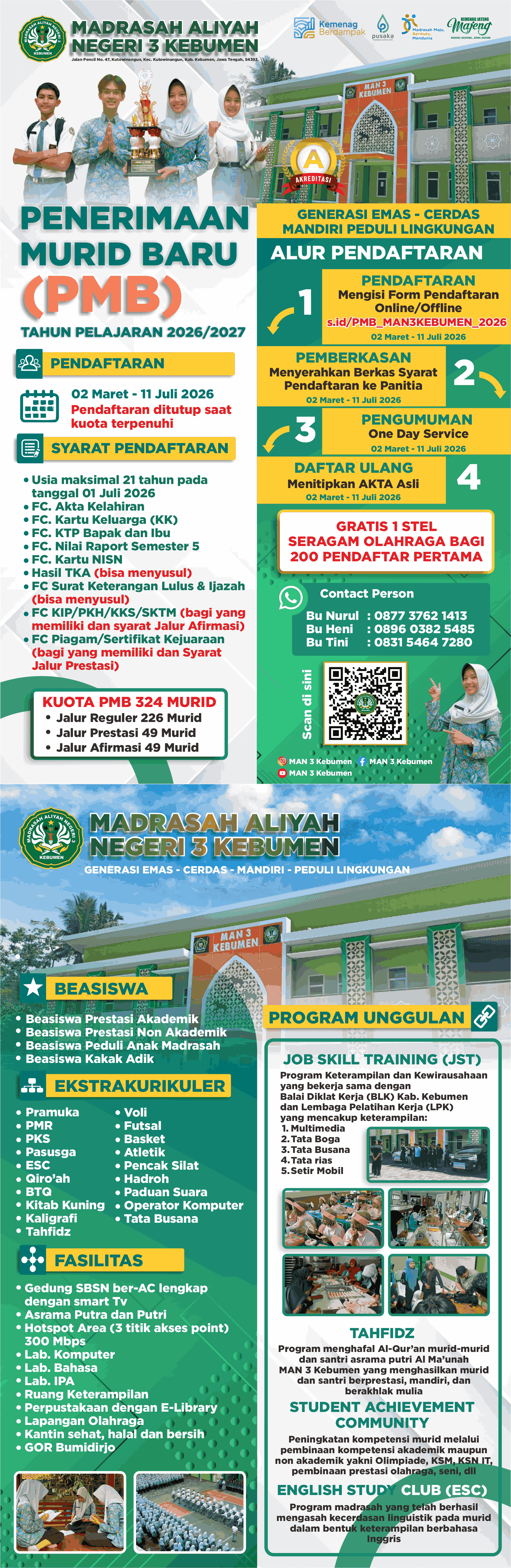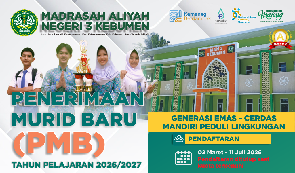 Brosur mengenai informasi Penerimaan Murid Baru (PMB) MAN 3 Kebumen Tahun Pelajaran 2026 - 2027